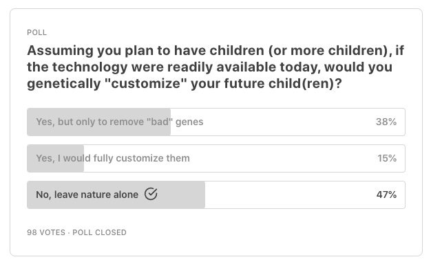Last monthâs results were interesting. Both questions were set up in such a way where there were two extremes straddling a middle-of-the-road answer. With genetic customization, it was clear that the majority of you - even those who would take advantage of it to some degree - felt that going all in with full customization was too much. I imagine that with each successive generation, as our humanity becomes increasingly intertwined with machines, that these perspectives will shift in the opposite direction.