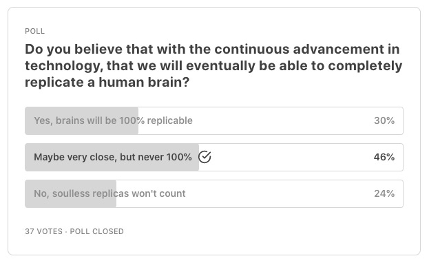 For the brain question, most voters seemed to hold a belief that there is some uniqueness to being human that AI and technology will not be able to completely replicate. That very same topic is the point of discussion in the 8th link in this monthâs ten must see links list. If you scrolled past it, definitely scroll back up and give it a watch - especially if you voted on this poll. Youâll enjoy it.