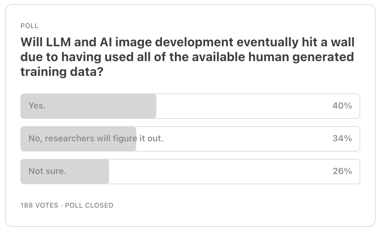 Last month’s poll was fairly close. At the moment it does seem like LLMs will hit a wall but of course many things seemed unlikely until they happened. One could argue that LLMs themselves seemed unlikely only five years ago and yet here we are. I’ll be honest and say that I don’t see how they will come up with a way around it, given that the models are built on finite human generated data. Some people speculate that synthetic data will provide a solution, but only time will tell.
