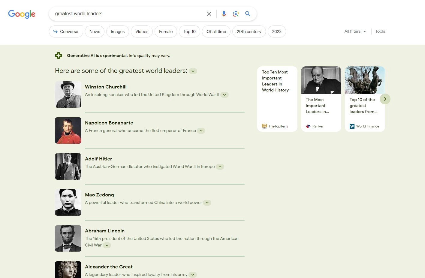 Google’s generative AI (SGE) feature has been catching some serious flack for repeatedly showing a certain leader in various search results, including for the queries greatest world leaders (seen below), most effective leaders, and inspirational world leaders.