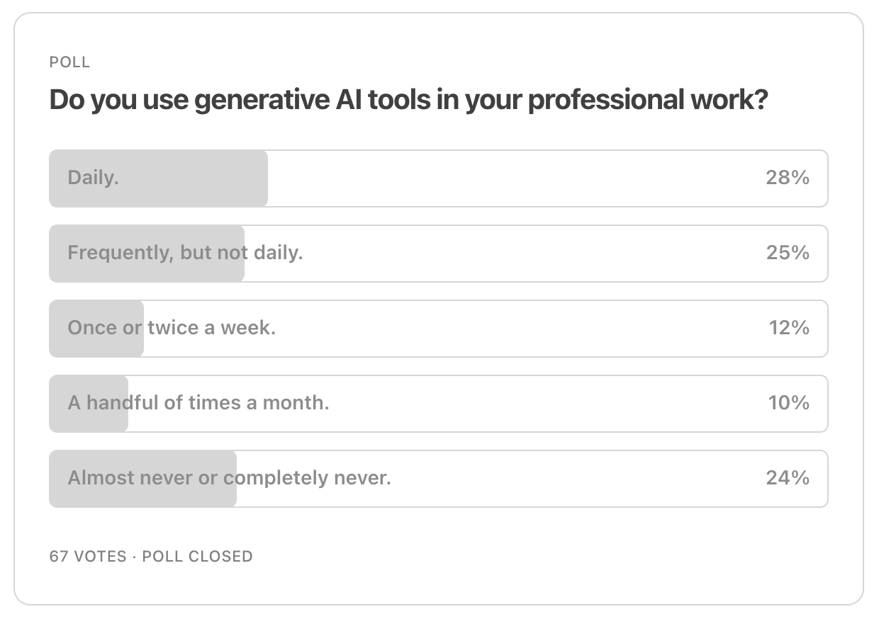 Unsurprisingly, more than half of us use generative AI in our work frequently. Based on the Andreessen Horowitz report we covered above, it’s likely that a good percentage of that number can be attributed to ChatGPT.
