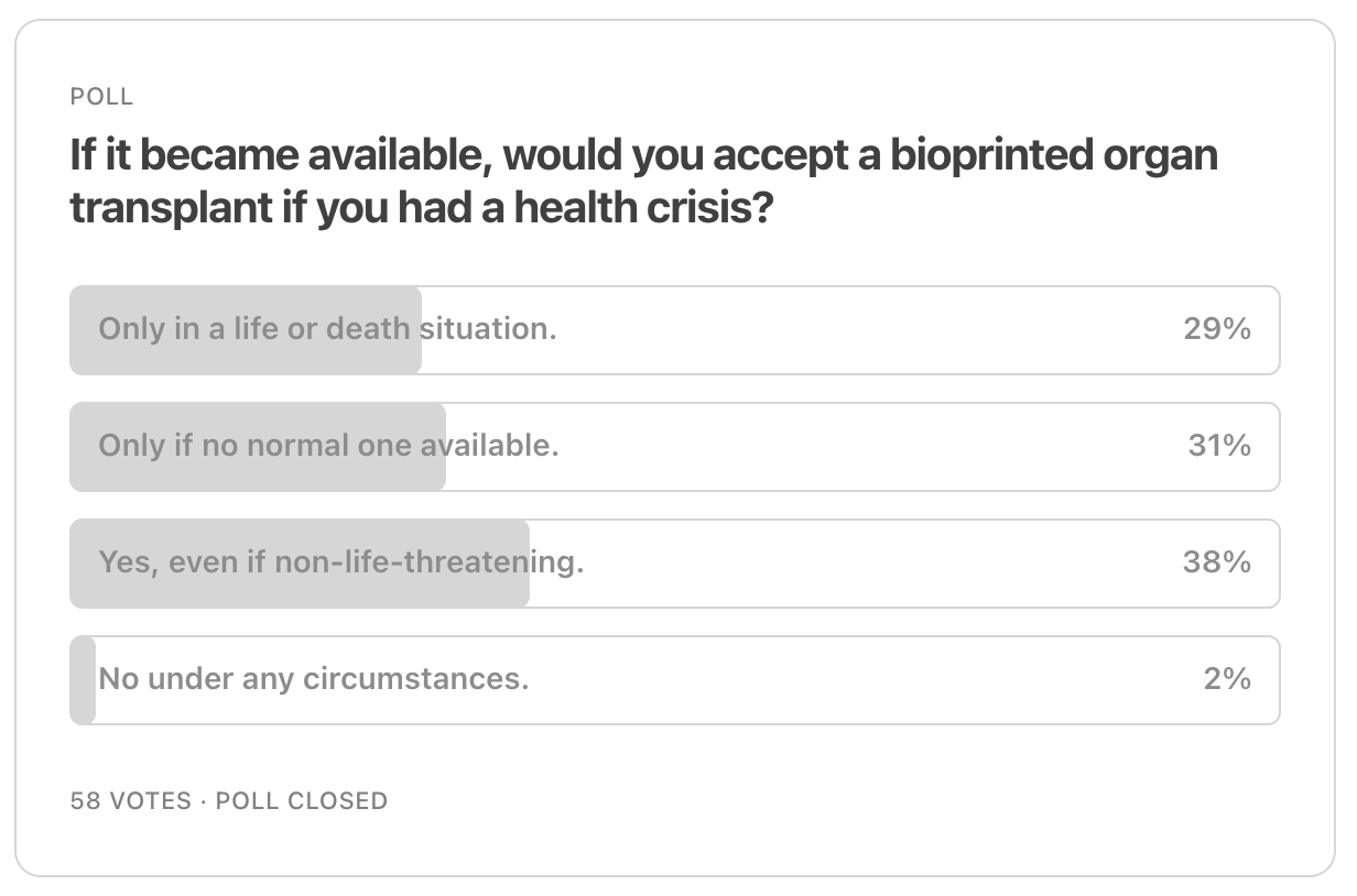 Looking at the results of last month’s polls, it’s clear that the vast majority of you have no ethical problem with 3D printed human organs.