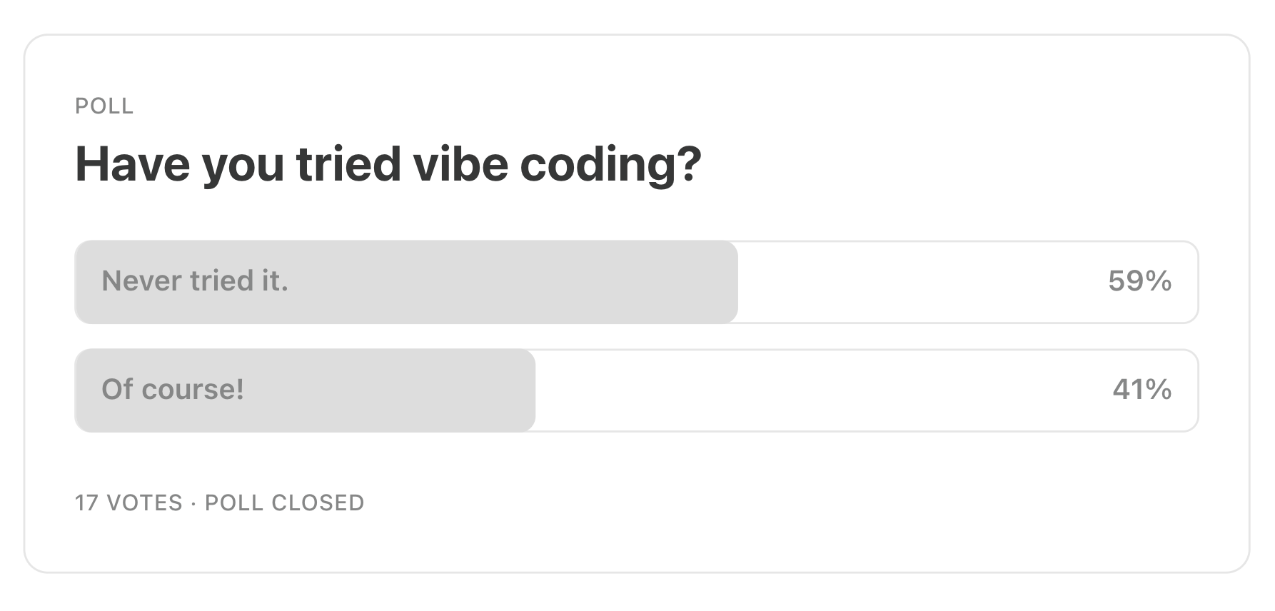 Although there weren’t that many voters on this poll, I was still surprised to see that the never trieds beat out the of coursers. Personally, I think vibe coding is fun but I also recognize its limits and don’t think it can fully replace programmers for any serious larger projects.